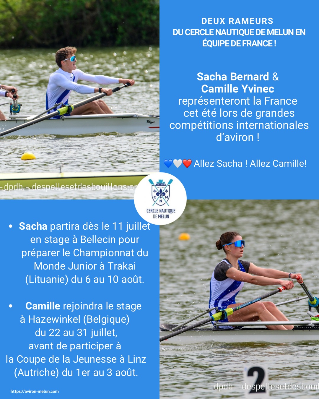 Le Cercle Nautique de Melun est fier d’annoncer que deux de ses jeunes talents, Sacha Bernard et Camille Yvinec, ont été sélectionnés pour intégrer les équipes nationales d’aviron et porter haut les couleurs du club et de la France lors des compétitions internationales de cet été.